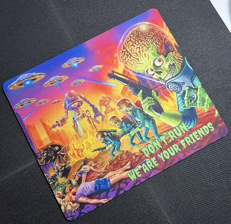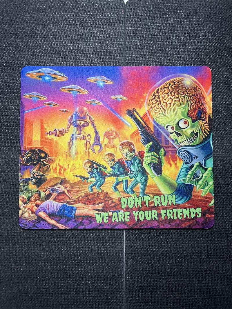 Mars Attacks themed mouse pad.Features & details•Non-slip base-use natural rubber, better grip. Can be firmly fixed on the•It is very easy to clean. you can only use clean water for cleaning, otherwise you can use detergent for cleaning.•Size:9.4" x 7.9" x0.12" (24*20*0.3cm)